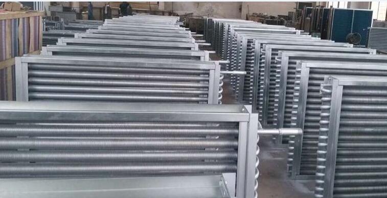 翅管式空氣換熱器由外形框架、順空氣的三排叉排列螺旋翅片管束組成,散熱翅片管通過機(jī)械繞片法,繞在無縫鋼管上,進(jìn)行表面鍍鋅處理,散熱翅片與散熱管接觸面廣而緊,傳熱性能良好,穩(wěn)定并且耐腐蝕。蒸汽或高溫水流經(jīng)鋼管之內(nèi),熱量通過緊繞在鋼管上的翅片傳給片面的空氣,達(dá)到加熱空氣的作用。